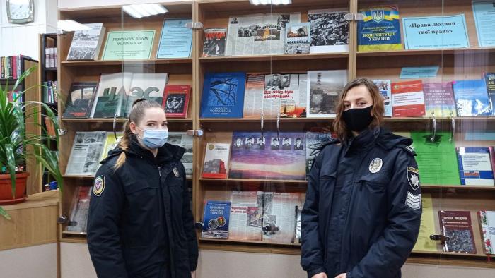 Напередодні Дня вшанування учасників ліквідації аварії на Чорнобильській АЕС, який в Україні щорічно відзначається 14 грудня, курсанти 4 курсу факультету № 4 разом зі своїми кураторами – доцентом кафедри конституційного і міжнародного права факультету № 4 кандидатом юридичних наук Ларисою Варунц і старшим викладачем цієї ж кафедри кандидатом юридичних наук Наталією Філіпською відвідали у науковій бібліотеці університету книжково-ілюстративну експозицію «Терновий вінок Чорнобиля».
