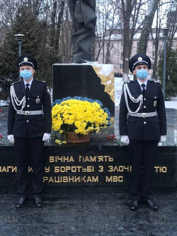 Усі присутні вшанували хвилиною мовчання пам’ять своїх колег, які загинули, виконуючи службовий обов’язок, та поклали квіти до монументу загиблим правоохоронцям.