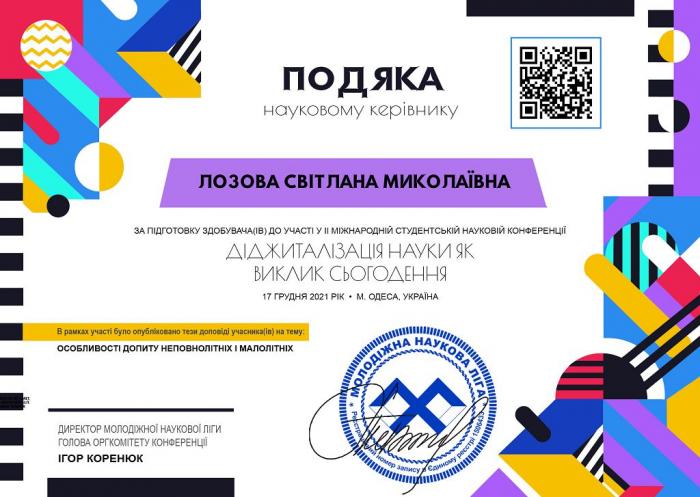 Науковий керівник – доцентка кафедри кримінального процесу, криміналістики та експертології факультету № 6 Світлана Лозова отримала подяку за підготовку здобувача освіти до участі в II міжнародній студентській конференції.