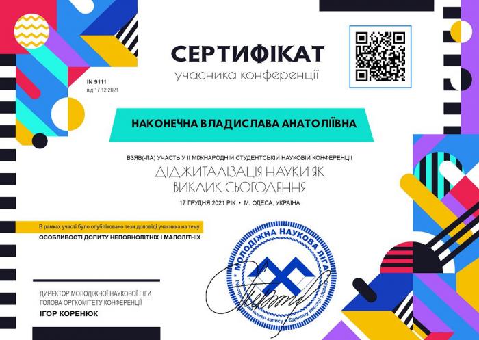 Владислава Наконечна взяла участь у II Міжнародній студентській науковій конференції «Діджиталізація науки як виклик сьогодення», що відбулася в місті Одеса та отримала сертифікат учасника.