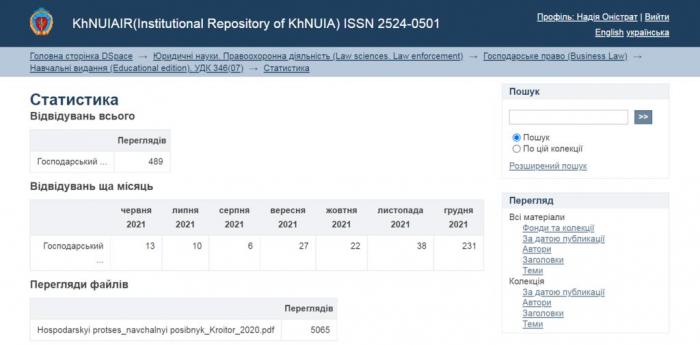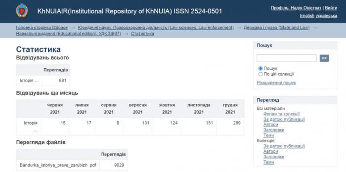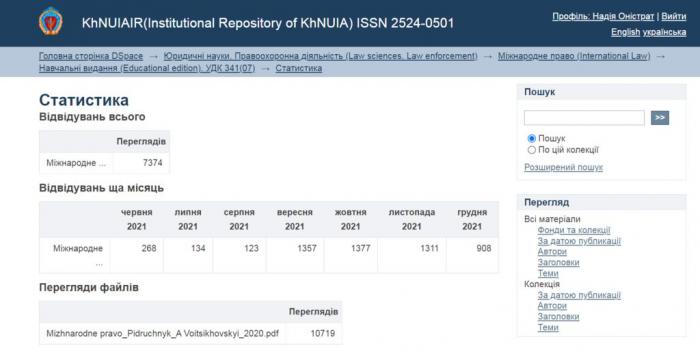 Наприкінці 2021 року науковою бібліотекою Харківського національного університету внутрішніх справ визначено найпопулярніші за переглядами публікації, що були розміщені в інституційному репозитарії KhNUIAIR*.