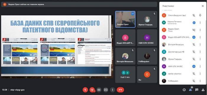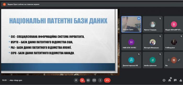 Під час заходу було розкрито основні цілі, види та типи патентного пошуку, представлено національні та міжнародні патентні бази даних, наведено загальний алгоритм патентного пошуку.