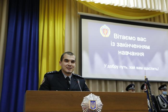 Від імені випускників керівництву університету, факультетів, викладачам, курсовим офіцерам за отримані знання, досвід та настанови подякував випускник магістратури факультету № 1 старший лейтенант поліції Віталій Найда та зачитав власного вірша про важливість і необхідність професії поліцейського.