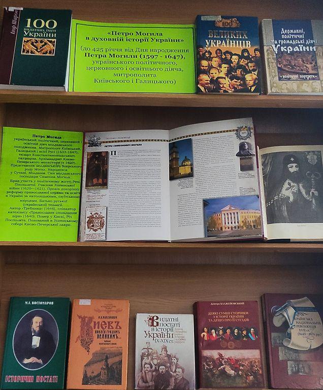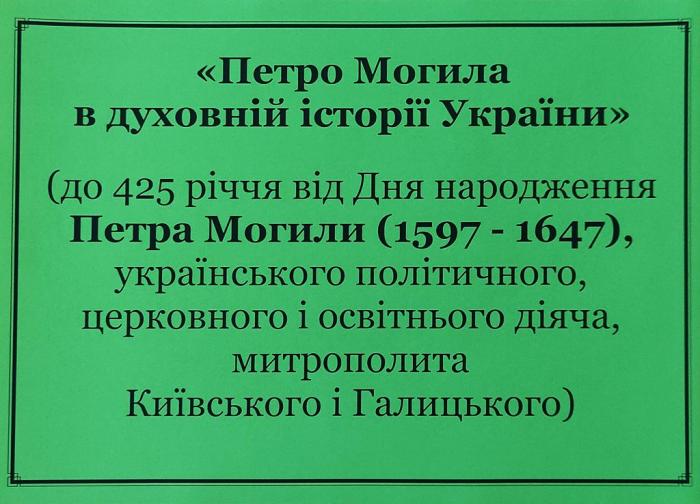 У науковій бібліотеці Харківського національного університету внутрішніх справ представлена книжкова виставка «Петро Могила в духовній історії України» до 425-річчя від дня народження Петра Могили – українського політичного, церковного і освітнього діяча, Митрополита Київського і Галицького, який мав титул «Екзарх Константинопольського трону».