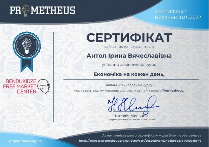 Доцентка кафедри правового забезпечення підприємницької діяльності та фінансової безпеки факультету № 6 Харківського національного університету внутрішніх справ Ірина Антол пройшла онлайн-курс «Економіка на кожен день» через платформу масових відкритих онлайн-курсів Prometheus та отримала сертифікат.