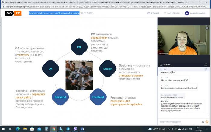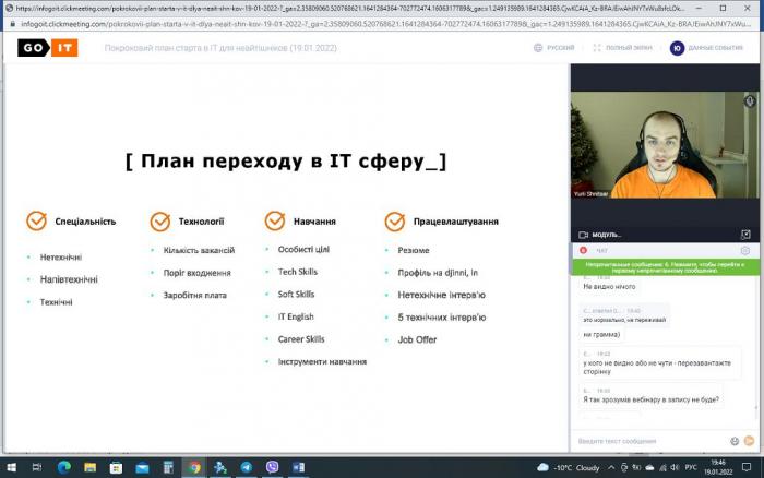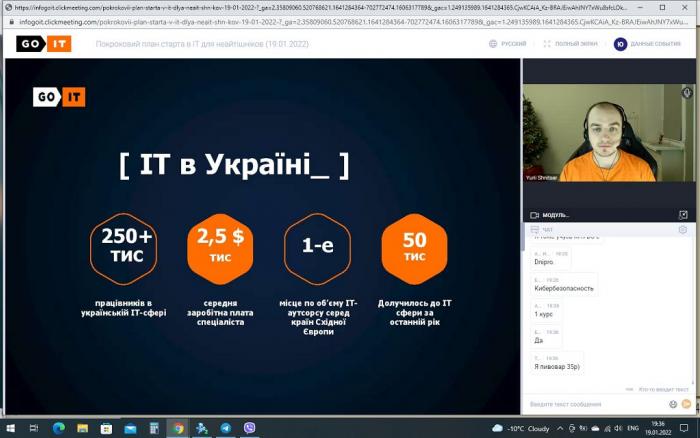 Студенти факультету № 6 Харківського національного університету внутрішніх справ, які навчаються за напрямом «Кібербезпека», взяли участь у вебінарі «Покроковий план старту в IT для неайтішніків», який було підготовлено компанією GoIT, що спеціалізується на підготовці фахівців для провідних ІТ-компаній. Під час вебінару було розглянуто сучасний стан ІТ-ринку праці, основні напрями IT-сфери, характеристики сучасних мов розробки програмних продуктів, вимоги до бажаючих працювати у галузі розробки складних програмних систем. Студенти також отримали практичні рекомендації та поради з підготовки до майбутнього працевлаштування в IT-галузі.