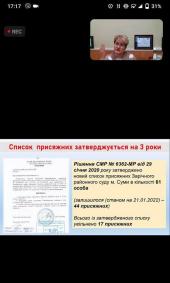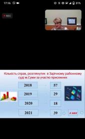 У Зарічному районному суді м. Суми відбулась онлайн-зустріч із присяжними. У заході взяла участь професорка кафедри юридичних дисциплін Сумської філії ХНУВС Наталія Горобець, яка вже третій рік поспіль є присяжною та активно бере участь у розгляді цивільних справ.