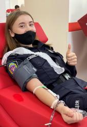 «Для мене це не просто так: «прийшов – здав, – говорить курсантка 2 курсу Сумської філії ХНУВС Єлізавета Шевцова. – 04 березня 2021 року я склала Присягу на вірність українському народу. У той же день мені виповнилося 18 років. Після урочистостей я одразу пішла на першу свою донацію і відтоді є постійним донором».