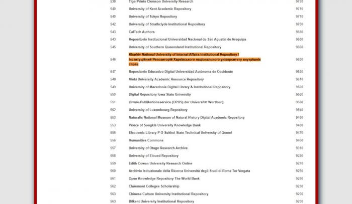 Оприлюднено тринадцяте видання міжнародного рейтингу репозитаріїв «Transparent Ranking: All Repositories (February 2022)» від Webometrics. До нього включено близько 4000 цифрових відкритих архівів світу. Інституційний репозитарій Харківського національного університету внутрішніх справ увійшов до рейтингу (KhNUIAIR) і посів 549 місце.