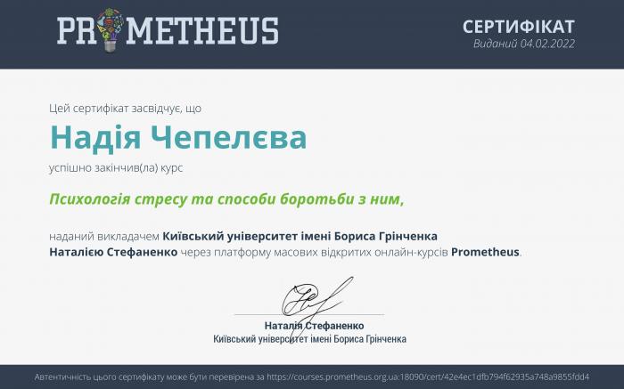 Викладачка кафедри соціології та психології факультету № 6 ХНУВС Надія Чепелєва пройшла онлайн курс підвищення кваліфікації з отриманням сертифікату на тему «Психологія стресу та способи боротьби з ним» від Київського університету імені Бориса Грінченка, через платформу масових відкритих онлайн-курсів Prometheus.
