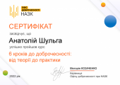 Професор кафедри фундаментальних та юридичних дисциплін факультету № 6 Анатолій Шульга успішно пройшов курс «6 кроків до доброчесності: від теорії до практики» та отримав сертифікат. Курс передбачає опрацювання певного теоретичного матеріалу та виконання практичних завдань, спрямований на розбудову в Україні прозорого та доброчесного освітнього середовища. Офіс доброчесності Національного агентства з питань запобігання корупції підготував низку й інших проектів популяризації академічної доброчесності. Відповідні матеріали стануть в нагоді всім учасникам освітнього процесу.