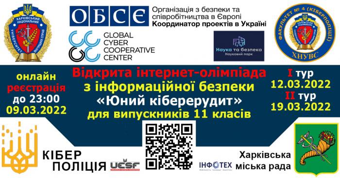 Факультет № 4 (кіберполіції) Харківського національного університету внутрішніх справ спільно з іншими співорганізаторами оголошує прийом електронних анкет-заявок від цьогорічних випускників закладів загальної середньої, професійної (професійно-технічної) та фахової передвищої освіти України для участі у третій Відкритій інтернет-олімпіаді з інформаційної безпеки «Юний кіберерудит».