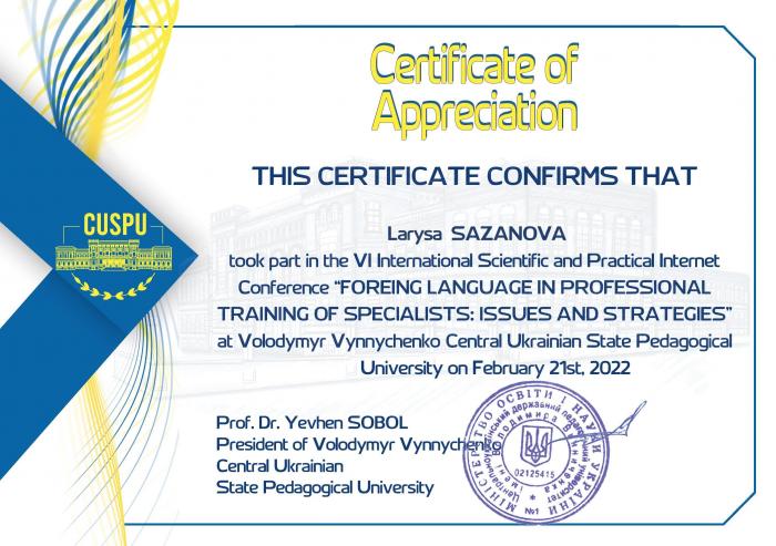 Старші викладачки кафедри іноземних мов факультету № 4 Лариса Сазанова та Любов Русанова взяли участь у VІ Міжнародній Інтернет-конференції «Іноземна мова у професійній підготовці спеціалістів: проблеми та стратегії» (“Information technologies in teaching foreign languages: issues and strategies”), яку організував Центральноукраїнський державний педагогічний університет імені Володимира Винниченка.