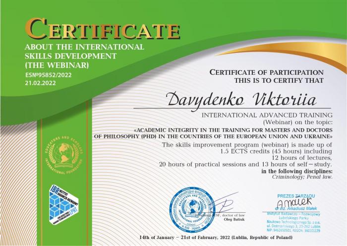 Доценти кафедри кримінального права та кримінології факультету № 6 Вікторія Давиденко й Ірина Луценко взяли участь у міжнародному підвищенні кваліфікації (вебінарі) наукових, науково-педагогічних працівників ЗВО та працівників закладів середньої освіти «Академічна доброчесність при підготовці магістрів та здобувачів доктора філософії (PhD) в країнах Європейського союзу та України». Захід відбувся у м. Люблін (Республіка Польща). За результатами участі у вебінарі науково-педагогічні працівники отримали сертифікати.