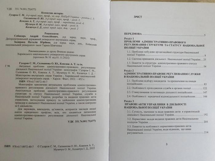 Попри всі складнощі та виклики воєнних часів, вчені Харківського національного університету внутрішніх справ продовжують свою науково-дослідну діяльність і мають певні публікаційні здобутки. Вийшла друком монографія «Актуальні проблеми адміністративно-правового регулювання діяльності Національної поліції України» (Гусаров С. М., Салманова О. Ю., Комзюк А. Т., Музичук О. М., Казанчук І. Д. / Міністерство внутрішніх справ України ; Харківський національний університет внутрішніх справ. – Харків : Факт, 2022. – 452 с.)