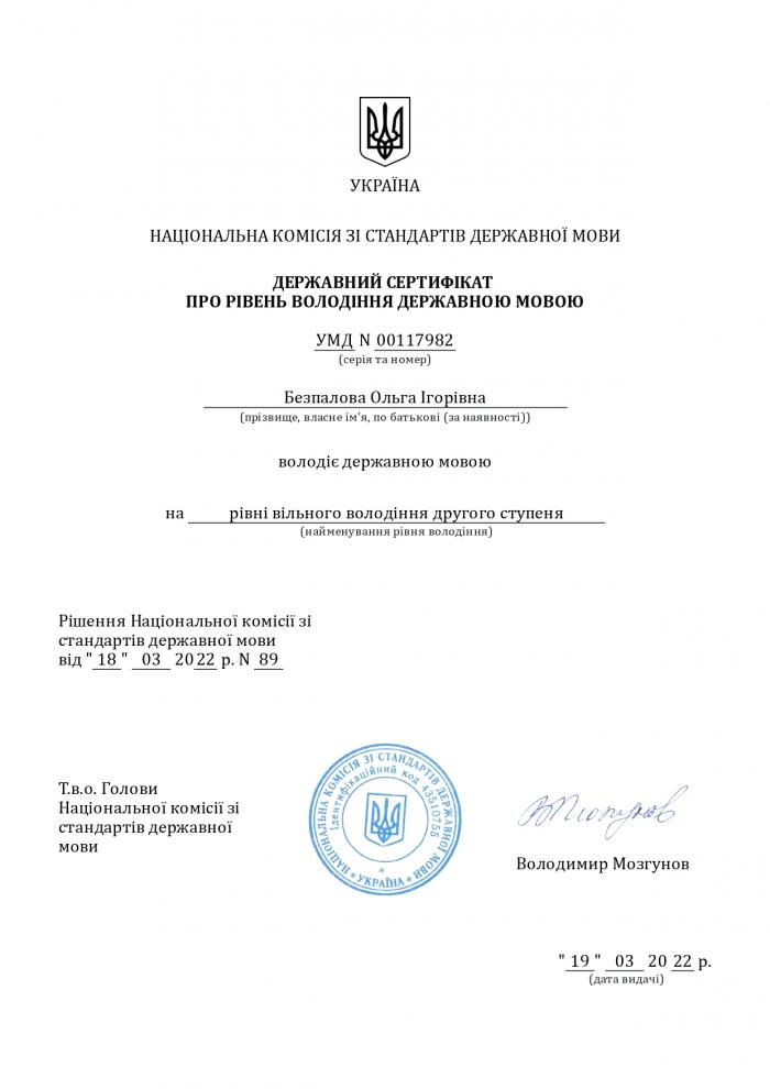 Завідувач кафедри поліцейської діяльності та публічного адміністрування факультету № 3 полковник поліції Ольга Безпалова та професор цієї ж кафедри підполковник поліції Олена Джафарова успішно склали іспит для визначення рівня володіння державною мовою та отримали державні сертифікати про рівень вільного володіння другого ступеня.