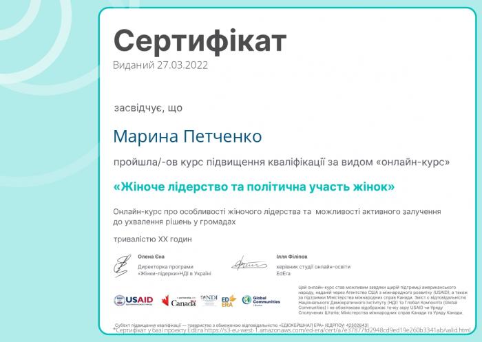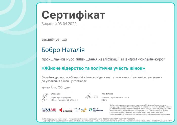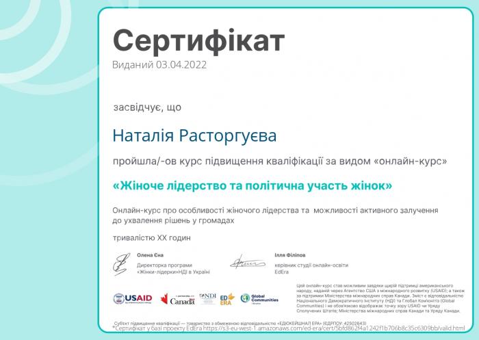 Представниці команди рівних можливостей - помічниця ректора Харківського університету внутрішніх справ з гендерних питань кандидатка юридичних наук, доцентка Оксана Цукан, доцентка кафедри соціально-економічних дисциплін кандидатка соціологічних наук Наталія Бобро, відповідальна особа з гендерних питань у Кременчуцькому льотному коледжі кандидатка економічних наук Марина Петченко, провідна фахівчиня Сумської філії Цвітана Скорина, голова Дебатного клубу та Школи ораторської майстерності cтарша лейтенантка поліції Наталія Расторгуєва пройшли підвищення кваліфікації за видом «онлайн-курс» на тему «Жіноче лідерство та політична участь жінок» на платформі EdEra. Онлайн-курс про особливості жіночого лідерства та можливості активного залучення до ухвалення рішень у громадах створений за підтримки американського народу через Агенство США з міжнародного розвитку та підтримки Міністерства міжнародних справ Канади. Він включав наступні модулі: жіноче лідерство крізь призму історії та сьогодення; участь жінок в ухваленні рішень: від першого кроку до представництва; комунікаційна стратегія лідерки та співпраця з медіа; гендерно орієнтоване врядування як вимога часу; побудова коаліцій задля досягнення цілей; підготовка та написання гендерно чутливих проектів.