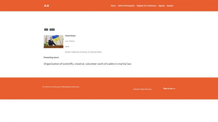 Віталій Найда виступить зі доповіддю «Організація наукової, творчої, волонтерської роботи курсантів в умовах воєнного стану» («Organization of scientific, creative, volunteer work of cadets in martial law»), під час якої представить напрямки та результати роботи Школи наукового лідерства Харківського національного університету внутрішніх справ в умовах воєнного стану.