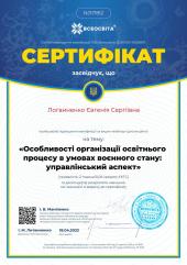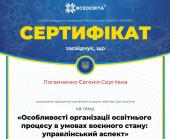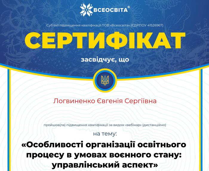 Доцент кафедри конституційного і міжнародного права факультету № 4 Євгенія Логвиненко пройшла навчання за програмою підвищення кваліфікації (участь у вебінарі) «Особливості організації освітнього процесу в умовах воєнного стану: управлінський аспект» ТОВ «Всеосвіта».