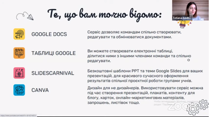 Під час заняття було зосереджено увагу на таких питаннях: 1. Методики та інструменти в подоланні стресу. 2. Здоров’язбережувальні технології. 3. Інструменти та платформи для якісної групової онлайн-роботи. Лекторка навела понад 30 сервісів, які розширюють можливості роботи з текстовими документами, таблицями, презентаціями, плакатами, картками, відео. Більшість програм безкоштовні та дозволяють працювати через мобільний застосунок.