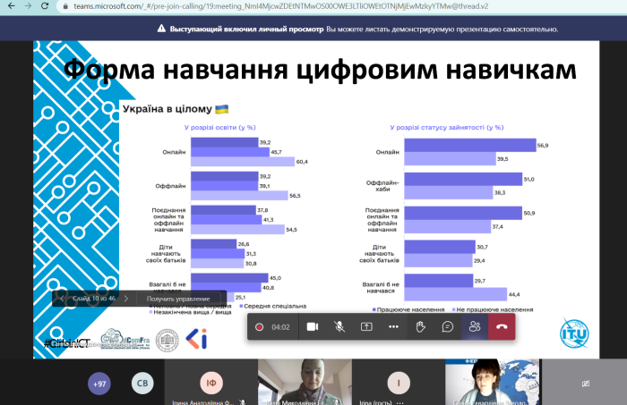 Під час вебінару учасники обговорили наступні актуальні теми: "Ґендер та Диджитал Дивайд"; "Цифрові компетентності, що сприяють доступу та безпеці в надзвичайних умовах"; "Використання ІКТ у STEM освіті та технологіях, як в мирний час, так і в умовах воєнного часу"; "Значення ІКТ в освіті", "Цифрові компетенції та ґендер у науці в умовах воєнного часу".