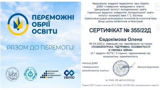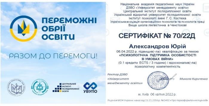 З метою вдосконалення психологічної майстерності працівники кафедри соціології та психології факультету № 6 Олена Євдокімова, Юрій Александров, Юлія Бойко-Бузиль, Наталія Греса пройшли курси підвищення кваліфікації за темою «Психологічна підтримка особистості в умовах війни» в Українському відкритому університеті післядипломної освіти.