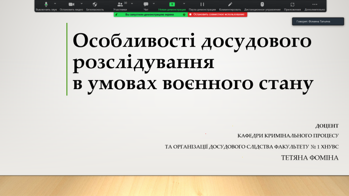 Відбулося засідання наукового гуртка на кафедрі кримінального процесу та організації досудового слідства факультету № 1 за допомогою платформи ZOOM. У роботі гуртка взяли участь курсанти, завідувач кафедри Віталій Романюк, керівниця наукового гуртка доцент кафедри Тетяна Фоміна, науково-педагогічні працівники кафедри.