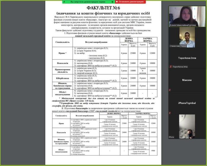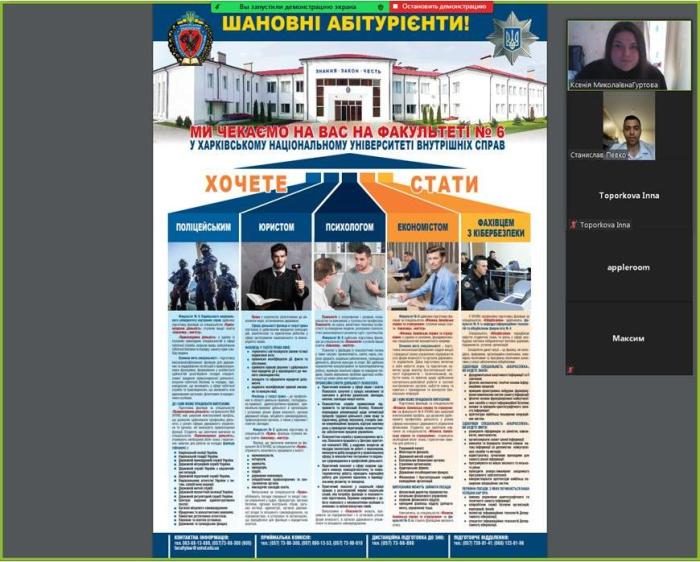 Представники кафедри фундаментальних та юридичних дисциплін факультету № 6 Харківського національного університету внутрішніх справ – доцент кафедри Станіслав Певко та викладачка кафедри Ксенія Гуртова під керівництвом начальника кафедри Юрія Холода провели профорієнтаційну онлайн-зустріч з учнями Комунального закладу «Харківська спеціалізована школа І-ІІІ ступенів № 93 Харківської міської ради Харківської області імені В.В. Бондаренка».
