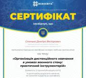 За результатами проходження підсумкового тесту Дмитро Слинько отримав сертифікат про підвищення кваліфікації. Набуті компетентності будуть використані в освітньому процесі.