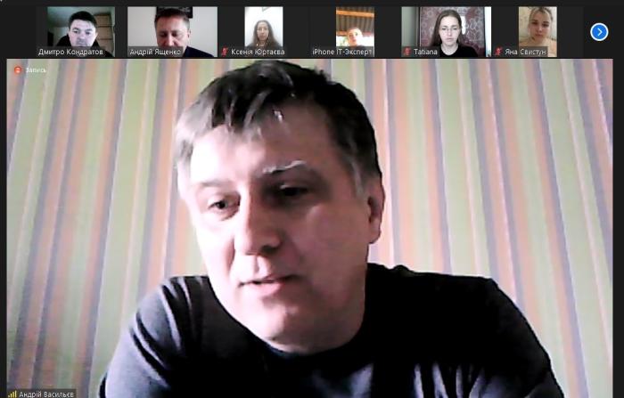 Доцент кафедри кандидат юридичних наук, доцент Андрій Васильєв виступив із доповіддю щодо особливостей протидії кримінальним правопорушенням, пов'язаним із незаконним заволодінням гуманітарною допомогою, акцентував увагу на важливості правильної кваліфікації воєнних злочинів, вчинених на території України.