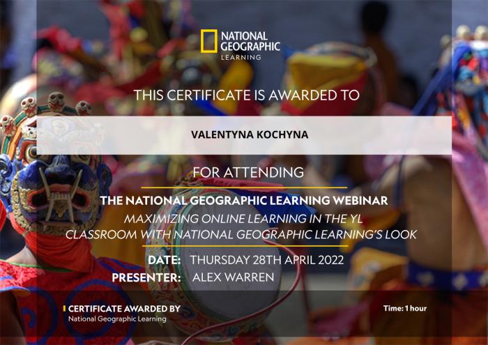 Спікер вебінару Алекс Воррен зосередився на питанні виховання успішних студентів та надійності онлайн-платформ, завдяки яким навчання є максимально ефективним. Було розглянуто ключові особливості онлайн-платформи National Geographic Learning, яка підтримує серію «Lооk». Викладачі кафедри отримали досвід використання цієї платформи для залучення студентів до творчого процесу та навчання. За результатами вебінару отримано сертифікати учасника.