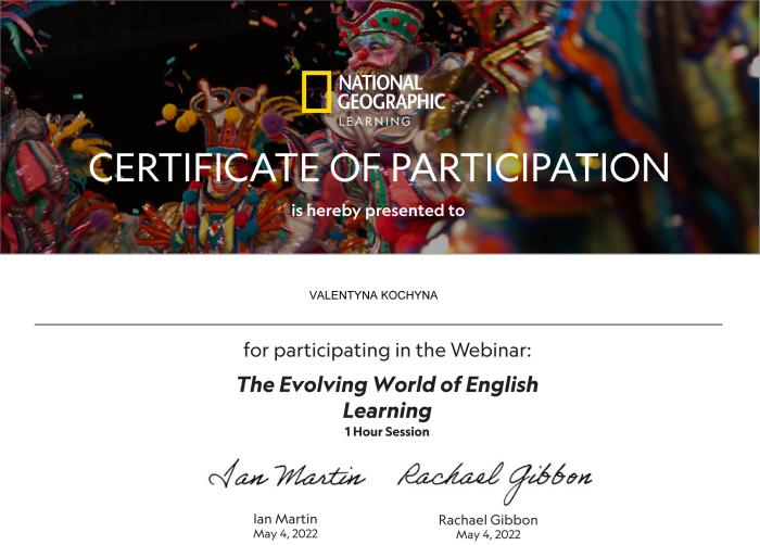 Завідувачка кафедри іноземних мов факультету № 4 Олена Статівка та викладачі цієї ж кафедри Артем Білоусов, Валентина Кочина, Валентина Почуєва та Лариса Сазанова відвідали онлайн-тренінг “The Evolving World of English Learning” від National Geographic Learning.