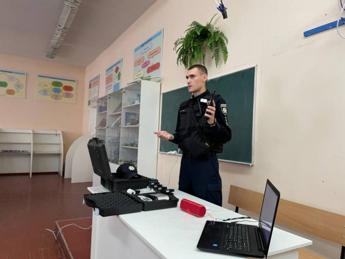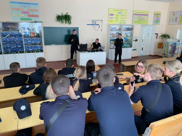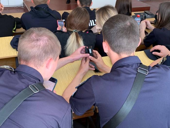 Курсанти були ознайомлені з функціонуванням технічних приладів, що використовуються під час реалізації службових завдань поліції: нагрудна бодікамера, пристрій для визначення алкоголю в крові Драгер, пристрій для визначення швидкості TruCAM, переносний термопринтер для друку постанов.