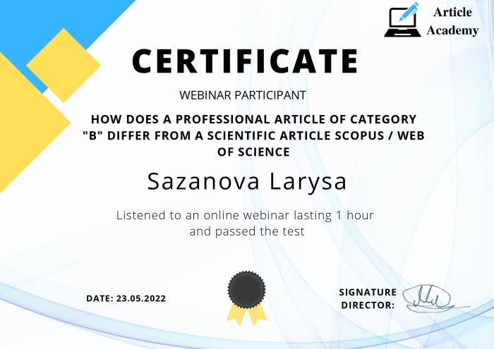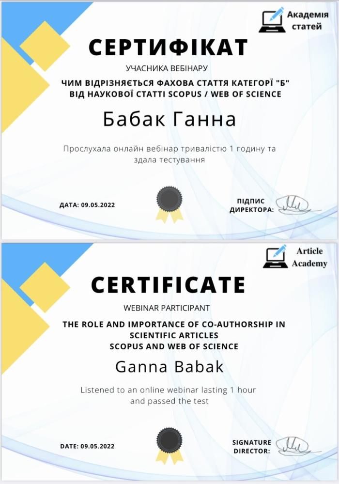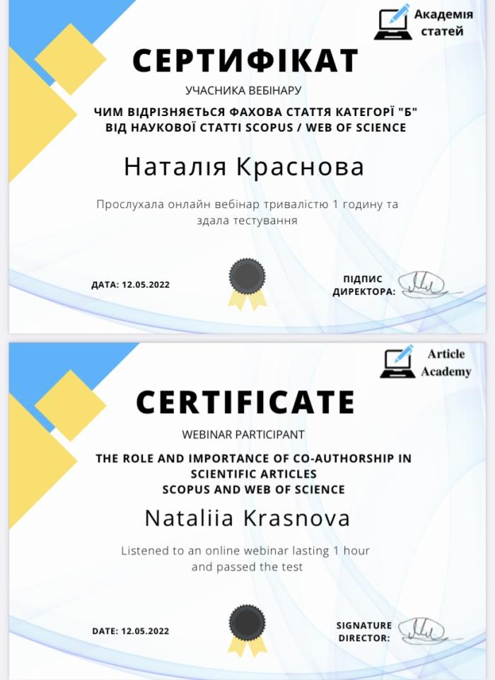 Старші викладачки кафедри іноземних мов факультету № 4 ХНУВС Наталія Краснова, Лариса Сазанова та викладачка цієї ж кафедри Ганна Бабак прослухали вебінар «Чим відрізняється фахова стаття категорії "Б" від наукової статті Scopus /Web of Science», пройшли опитування та успішно склали тестування. За результатами вебінару отримано сертифікат учасника.
