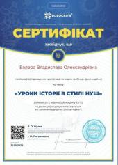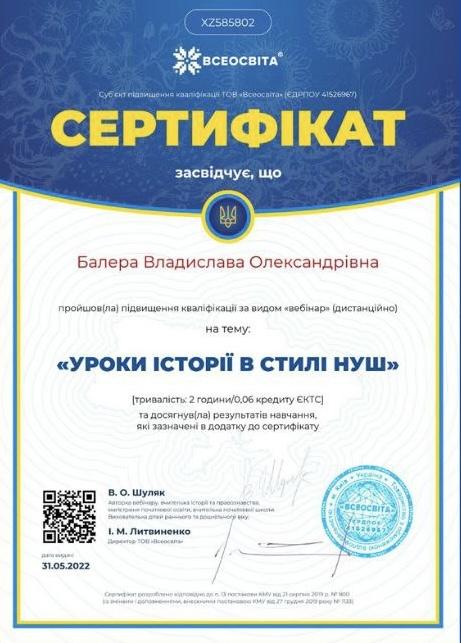 Учасниця Школи наукового лідерства Харківського національного університету внутрішніх справ курсантка 3 курсу факультету № 1 Владислава Балера пройшла вебінар-підвищення кваліфікації на тему «Уроки історії в стилі НУШ» на освітній платформі «Всеосвіта».