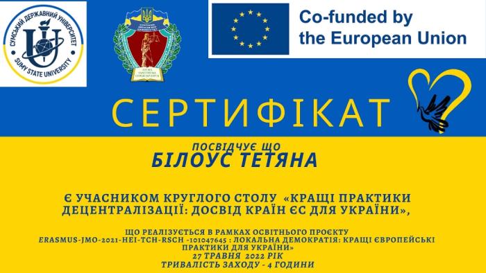 Доцент кафедри гуманітарних дисциплін Сумської філії Харківського національного університету внутрішніх справ Тетяна Білоус онлайн взяла участь у круглому столі «Кращі практики децентралізації: досвід країн ЄС для України».