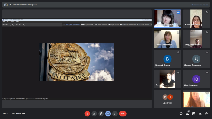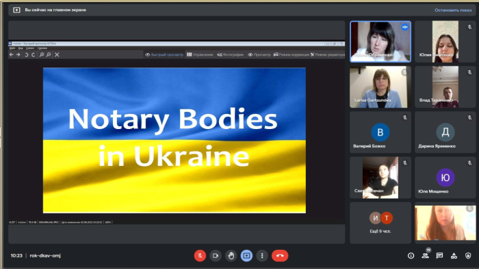 У межах дистанційного освітнього процесу викладач кафедри гуманітарних дисциплін Сумської філії ХНУВС Анна Решитько організувала бінарне заняття для здобувачів-правників за участі головного спеціаліста Центрального відділу з питань нотаріату Управління нотаріату Північно-Східного міжрегіонального управління Міністерства юстиції у м. Суми Наталії Обраменко за темою "Нотаріальні органи України" (Notary Bodies in Ukrainе).