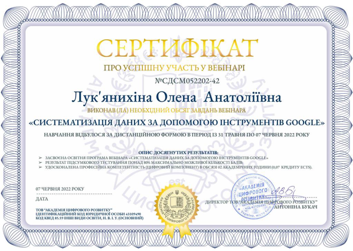 Завідувач кафедри соціально-економічних дисциплін Сумської філії ХНУВС Олена Лук’янихіна стала учасником вебінару «Систематизація даних за допомогою інструментів Google», організатор – «Академія цифрового розвитку» (м. Київ).