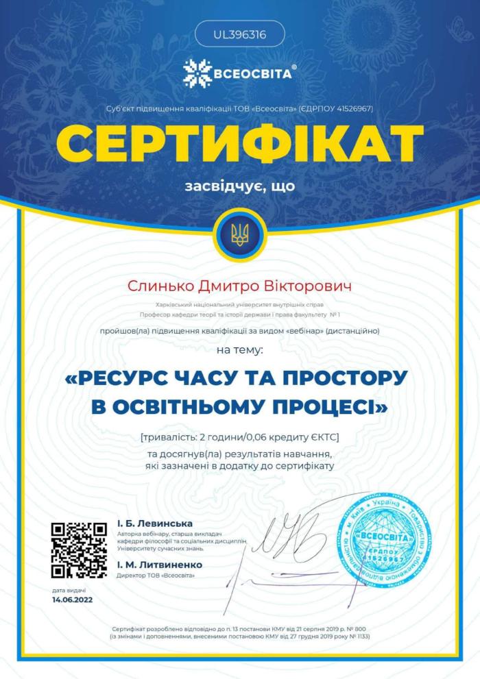 Професор кафедри теорії та історії держави і права факультету № 1 Дмитро Слинько пройшов навчання за програмою підвищення кваліфікації, взявши участь у вебінарі «Ресурс часу та простору в освітньому процесі» ТОВ «Всеосвіта».