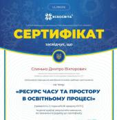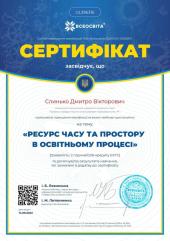За результатами проходження підсумкового тесту Дмитро Слинько отримав сертифікат про підвищення кваліфікації. Набуті компетентності будуть використані в освітньому процесі.