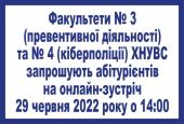29 червня 2022 року о 14:00 на платформі Zoom відбудеться онлайн-зустріч керівництва факультетів № 3 (превентивної діяльності) та № 4 (кіберполіції) Харківського національного університету внутрішніх справ із майбутніми абітурієнтами, які бажають вступити на навчання за державним замовленням.