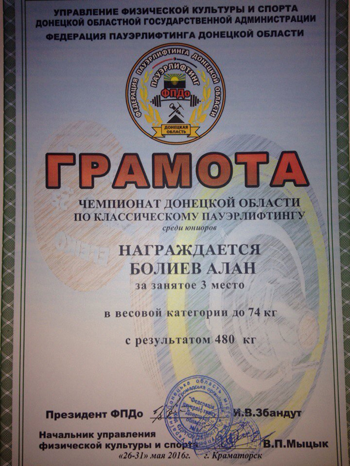 У м. Краматорськ пройшов чемпіонат Донецької області з класичного пауерліфтингу. Алан Болієв – слухач магістратури факультету № 1 Харківського національного університету внутрішніх справ став бронзовим призером змагань за результатом виконаних вправ: жим лежачи – 115 кг; станова тяга – 215 кг; присідання – 150 кг.