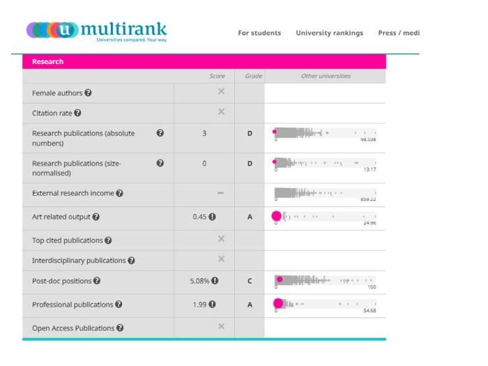 U-Multirank пропонує широкий спектр інформації про понад 30 показників у п’яти вимірах ефективності: «Викладання та навчання», «Дослідження», «Передача знань», «Міжнародна орієнтація» та «Регіональний вплив». Це дозволяє порівнювати успішність університету в різних видах діяльності, ранжируючи від «А» (дуже добре) до «E» (слабкий).