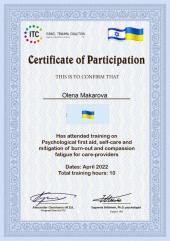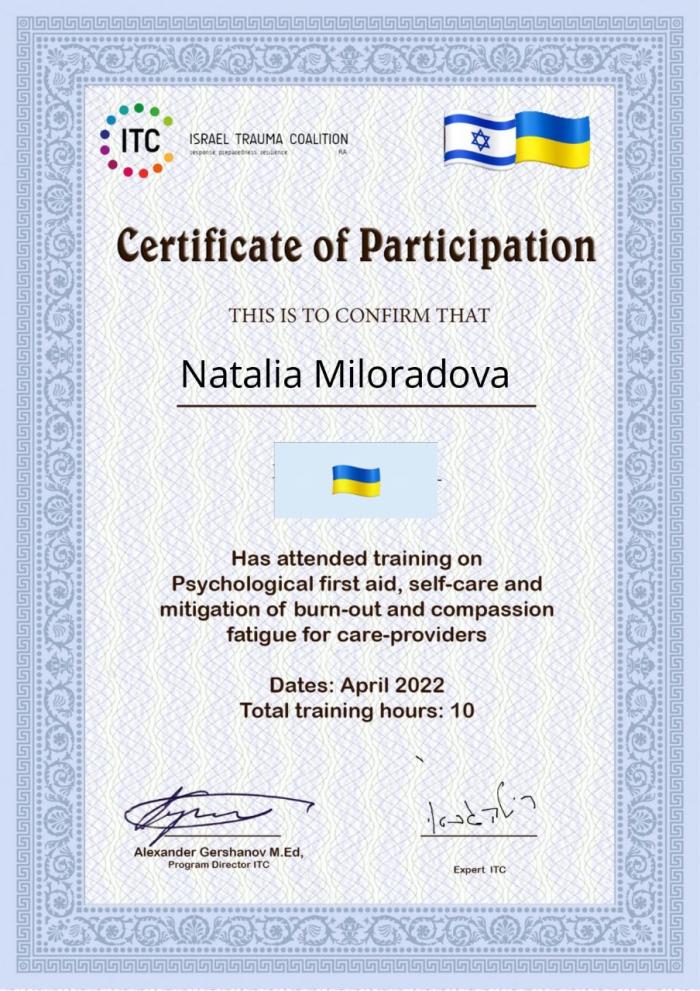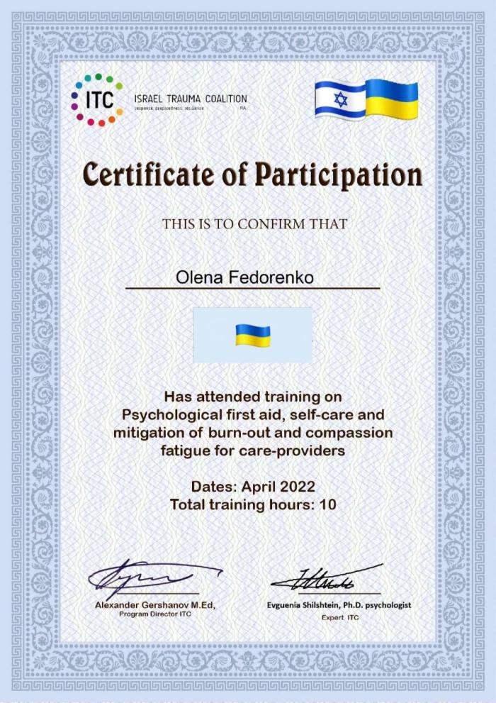 Представниці кафедри педагогіки та психології факультету № 3 ХНУВС Олена Федоренко, Наталія Мілорадова, Вікторія Доценко і Олена Макарова пройшли навчання на онлайн платформі trauma_ua за двома модулями – «Базовий курс кризової самодопомоги та допомоги ближньому» та «Зниження впливу травматичної події на якість життя», та отримали сертифікати від Ізраїльської коаліції по роботі з травмою (ITS – Israel Trauma Coalition).