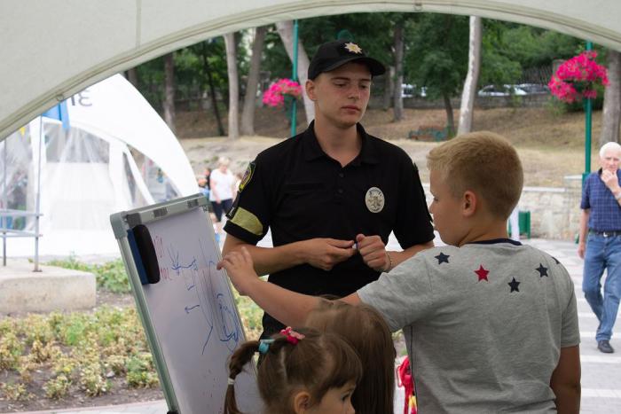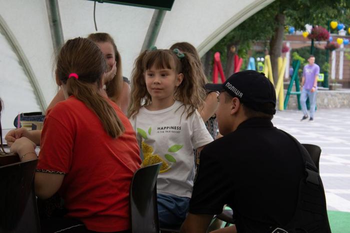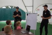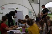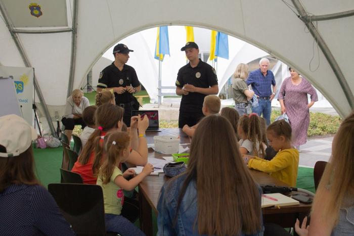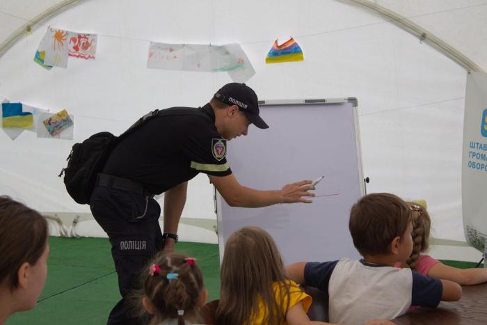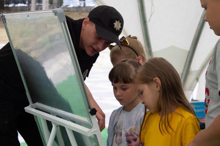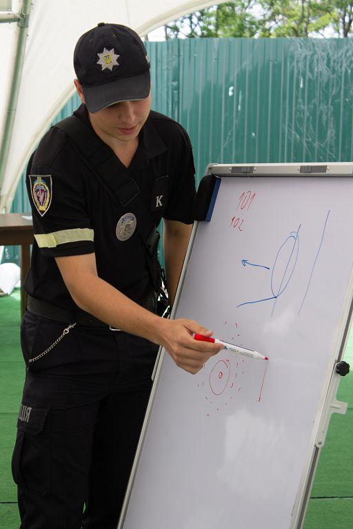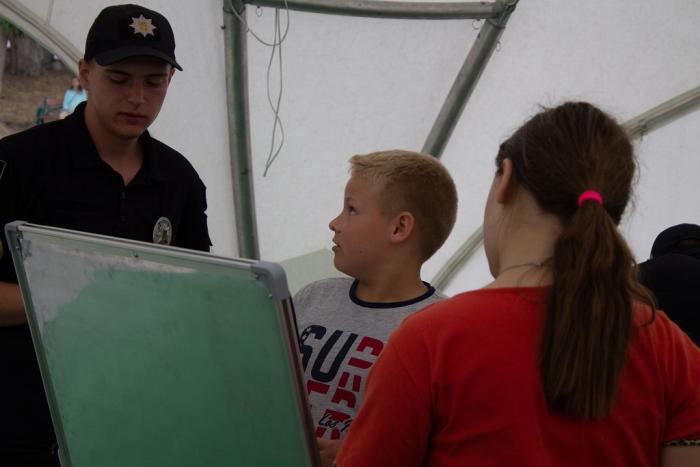 Курсанти розповіли малечі про правила безпеки під час прогулянок лісом, про поводження біля водойм, про службу в Національній поліції України та Державній Службі з надзвичайних ситуацій в умовах воєнного стану, про виконання поліцейськими бойових завдань та реагування на повідомлення громадян, опрацювали ситуацію щодо виявлення небезпечних предметів та в інтерактивному форматі навчили дітей правильному алгоритму дій. До тренінгу також активно долучилися й батьки, брали участь у практичних вправах та слухали виступи курсантів.