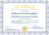 Після завершення тренінгу Наталія Кобилко пройшли тестування й, набравши відповідну кількість балів, отримала сертифікат про успішну участь в онлайн-тренінгу та удосконалення професійної компетентності (цифровий компонент).