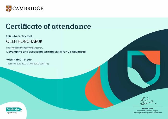 Для вдосконалення навчання писемного іншомовного мовлення представники кафедри іноземних мов факультету № 4 ХНУВС завідувачка кафедри Олена Статівка та викладачі кафедри Валентина Почуєва, Любов Русанова, Валентина Кочина, Лариса Сазанова, Олег Гончарук та Артем Білоусов взяли участь у міжнародному онлайн-вебінарі «Developing and assessing writings kills for C1 Advanced» від Cambridge University Press & Assessment, де були розглянуті такі питання як: визначення смислових частин тексту та його ключових речень; розвиток думки у зв'язку з ключовими словами, пропозиціями; завдання щодо трансформації тексту; безперервність і послідовність у навчанні даному виду мовленнєвої діяльності.