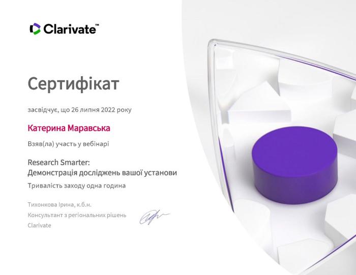 Старша наукова співробітниця відділення організації наукової роботи відділу організації наукової діяльності та захисту інтелектуальної власності Катерина Маравська взяла участь у вебінарі від Clarivate на тему «Research Smarter: Демонстрація досліджень вашої установи». Спікеркою заходу виступила консультант із регіональних рішень Clarivate кандидат біологічних наук Ірина Тихонкова.