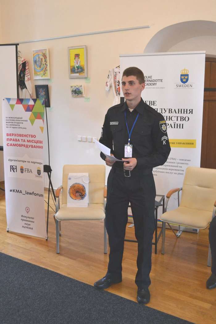 Представники Наукового товариства студентів, курсантів, слухачів, аспірантів, ад’юнктів, докторантів і молодих вчених Харківського національного університету внутрішніх справ, курсанти факультету № 2 Вадим Мальцев, Владислав Петров та Кристина Щербань взяли участь у III Міжнародному науково-практичному форумі студентів та аспірантів «Верховенство права та місцеве самоврядування». Захід відбувся на базі Національного університету «Києво-Могилянська академія» у м. Київ.