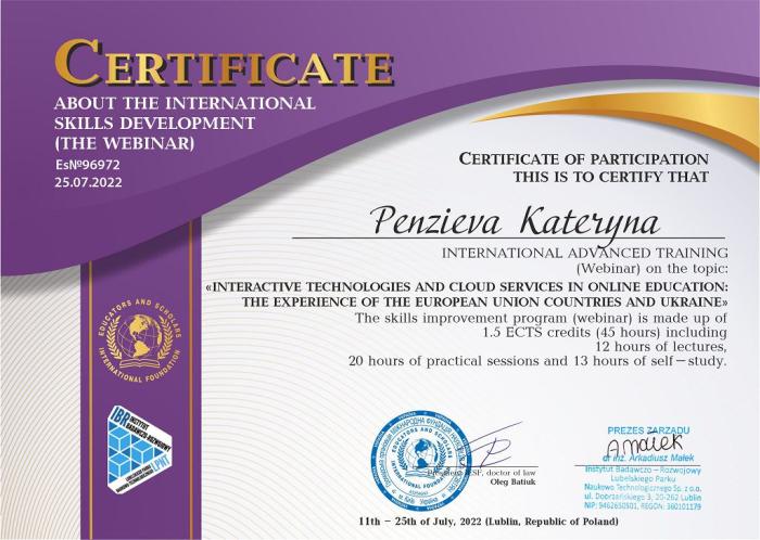 Під час проходження підвищення кваліфікації учасники ознайомилися та здобули практичні навички з упровадження та використання в освітньому процесі новітніх технологій, засвоїли засади організації плідної комунікативної взаємодії учасників освітнього процесу в мережі Інтернет, ознайомилися з сучасними технологіями організації інтерактивного дистанційного навчання та гейміфікації освіти, що є гарантіями забезпечення плідного навчального процесу.